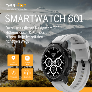 Jetzt in zwei eleganten Varianten: die neue beafon Premium Smartwatch 601, in Schwarz mit gleich zwei Sportbänder in den Farben Schwarz und Grau.