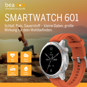 Jetzt in zwei eleganten Varianten: die neue beafon Premium Smartwatch 601, in Schwarz mit gleich zwei Sportbänder in den Farben Schwarz und Grau.